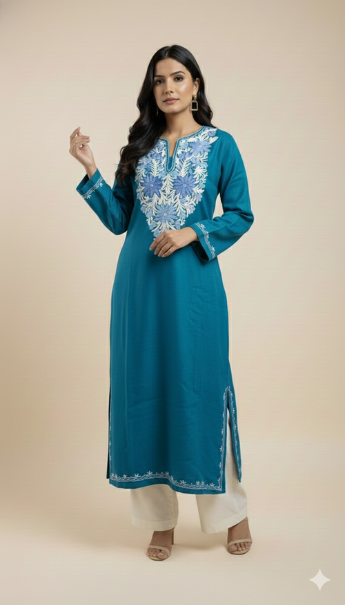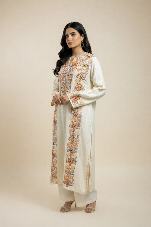 Ivory Hand-Embroidered Kashmiri Pheran with Floral Motifs